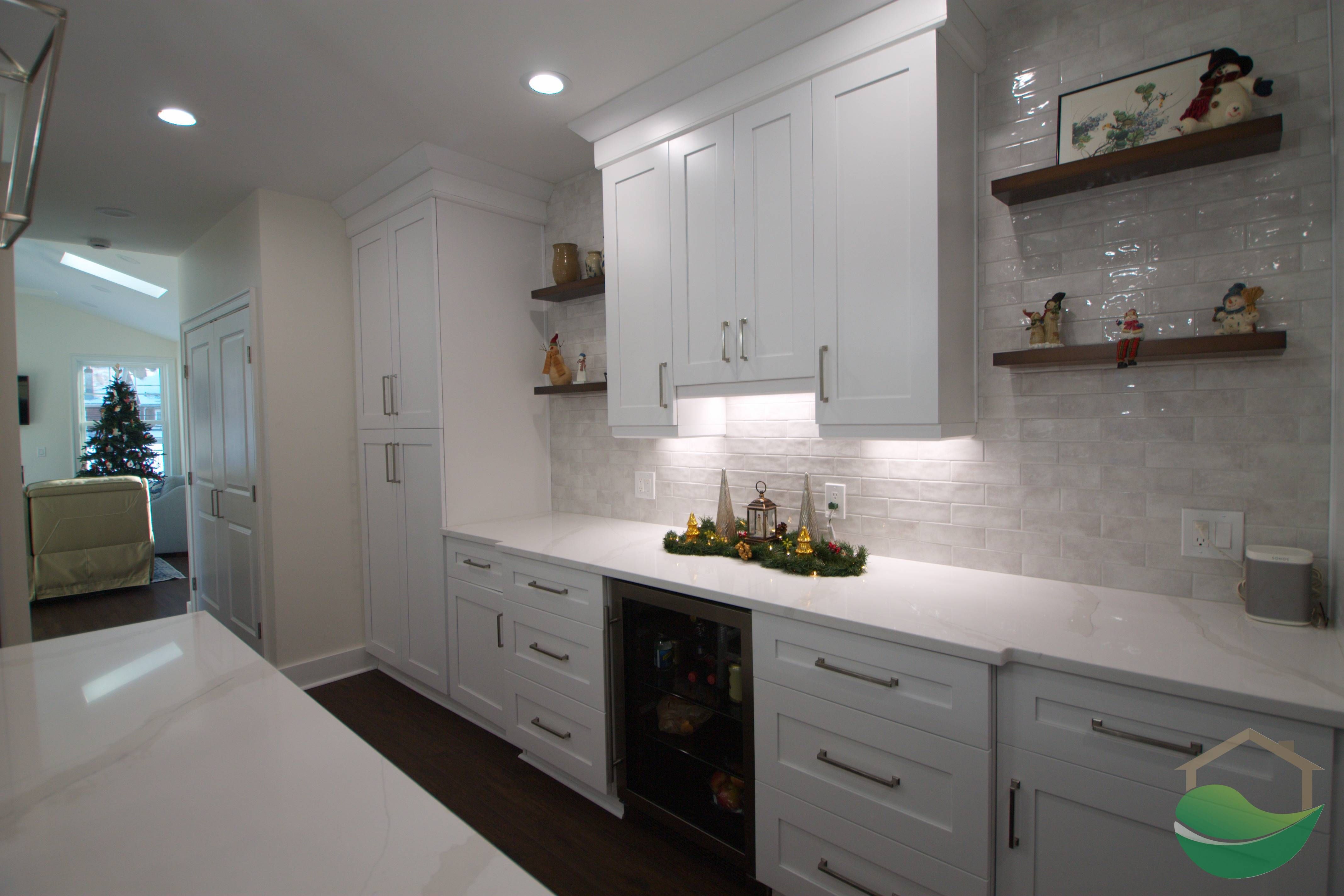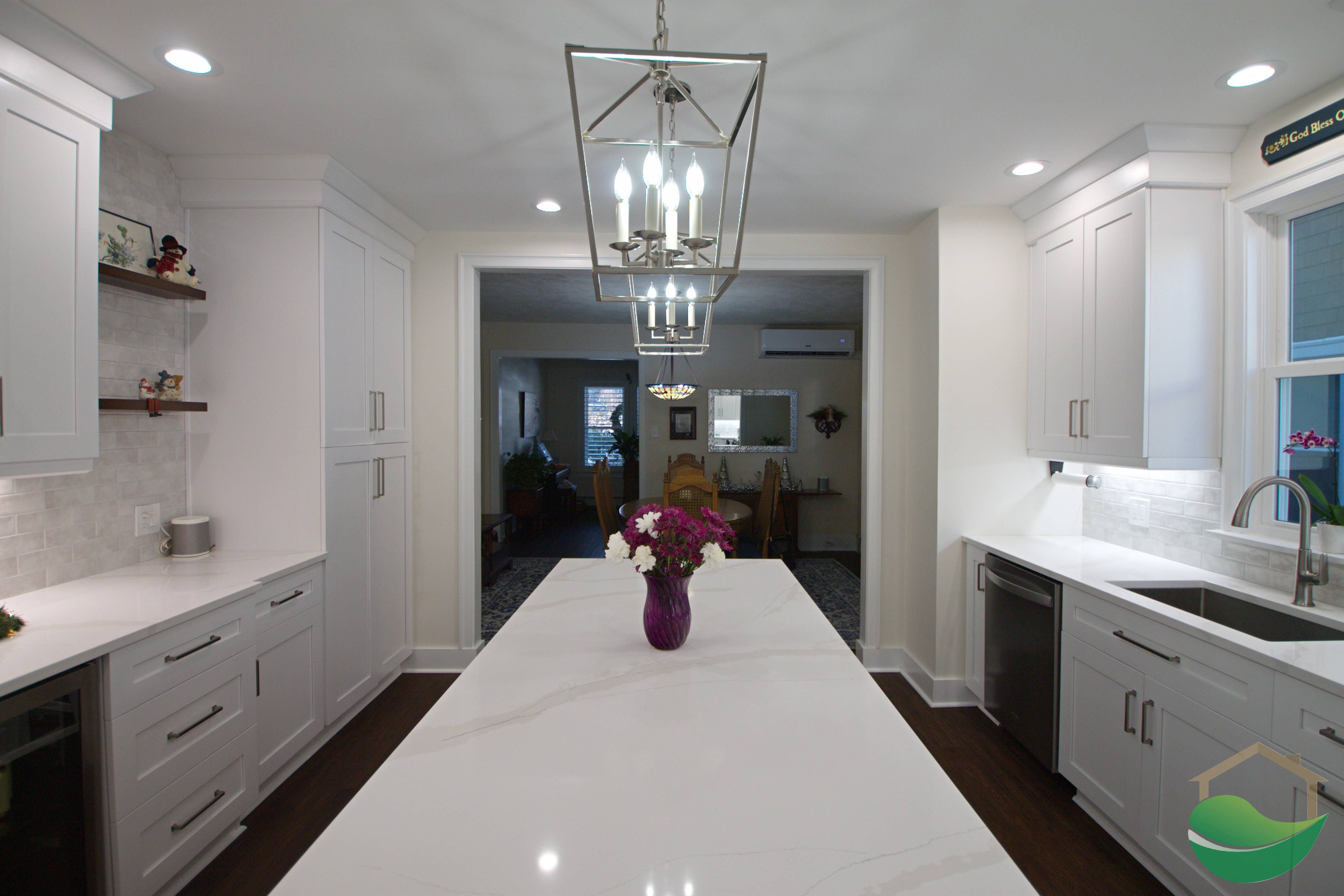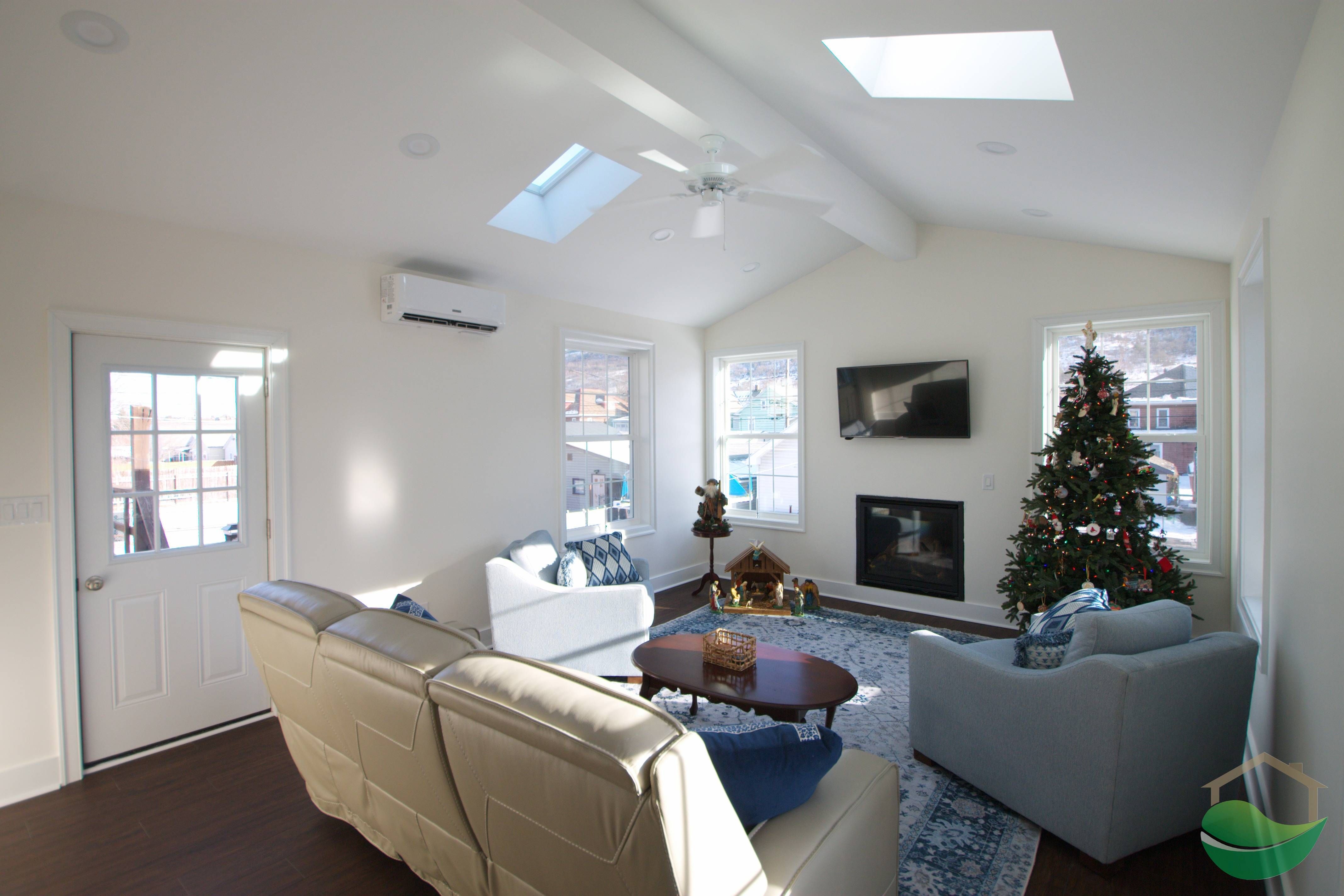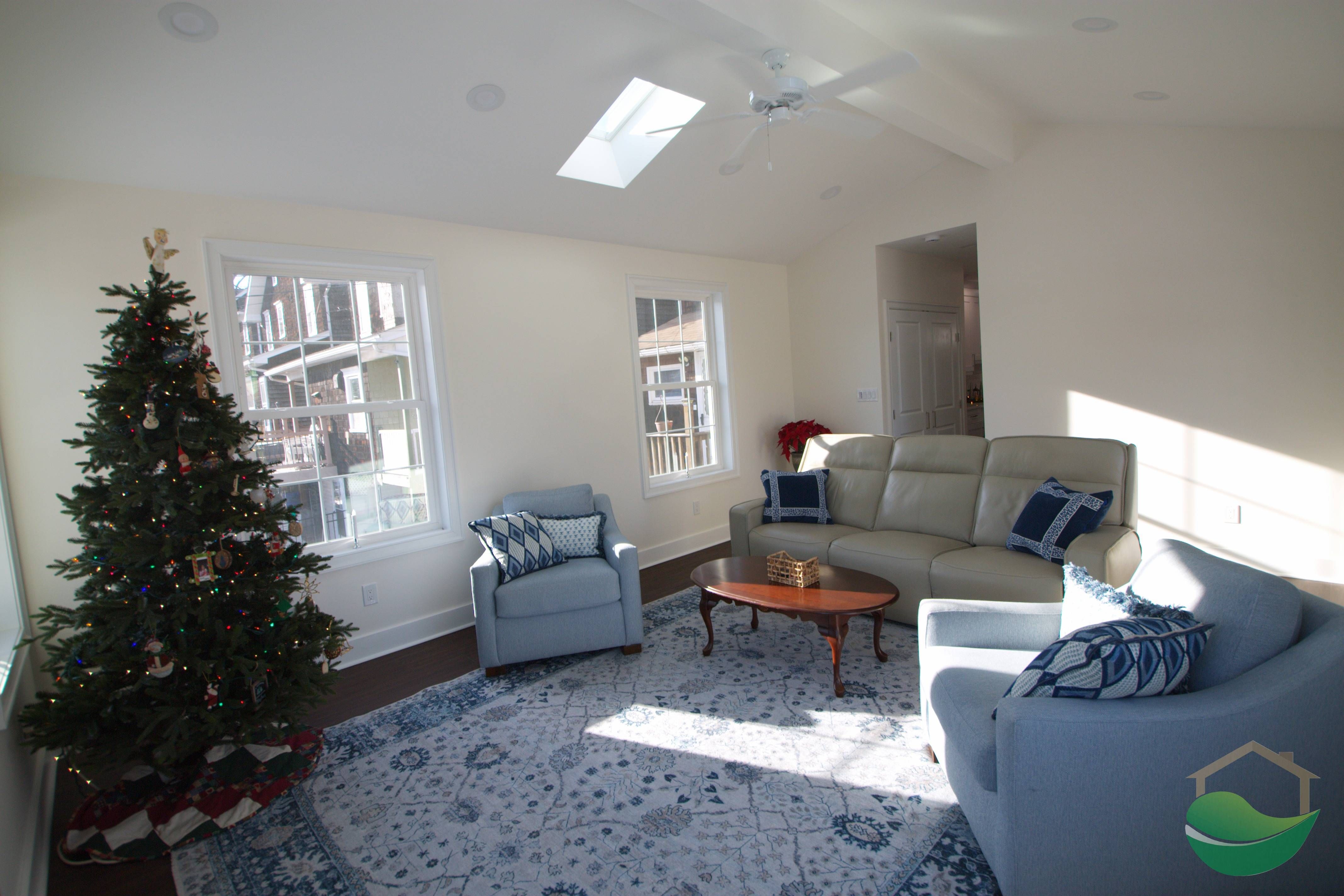 This project was a custom addition built onto a half-double home, a layout that required detailed planning and structural expertise. To create an open-concept kitchen, we installed a hidden steel beam in the ceiling, allowing us to remove load-bearing walls while maintaining full support. The kitchen features white Shaker cabinets with a Carrara quartz countertop for a clean, timeless look. To maximize space, we also removed and relocated the staircase underneath a front-entry closet, creating a larger and more functional kitchen layout. The new great room includes two Velux skylights and a natural gas fireplace with a new gas line installed from the alley. The homeowner is still deciding on a final accent wall design around the fireplace and TV, which will complete the space. What made this project especially challenging was completing all of this within the constraints of a half-double property, where every structural change required careful coordination and craftsmanship. The result is a modern, open, and fully transformed living space.