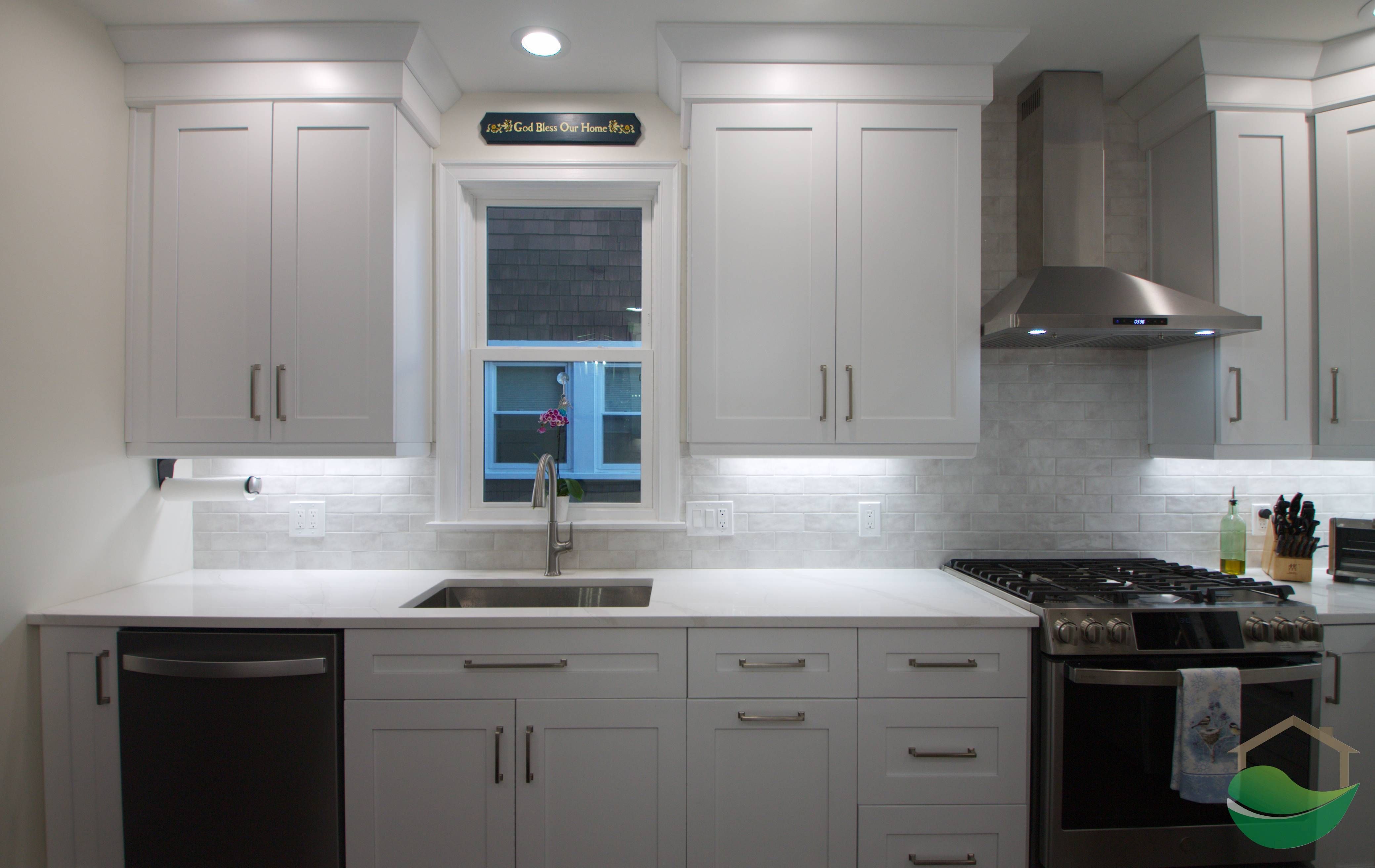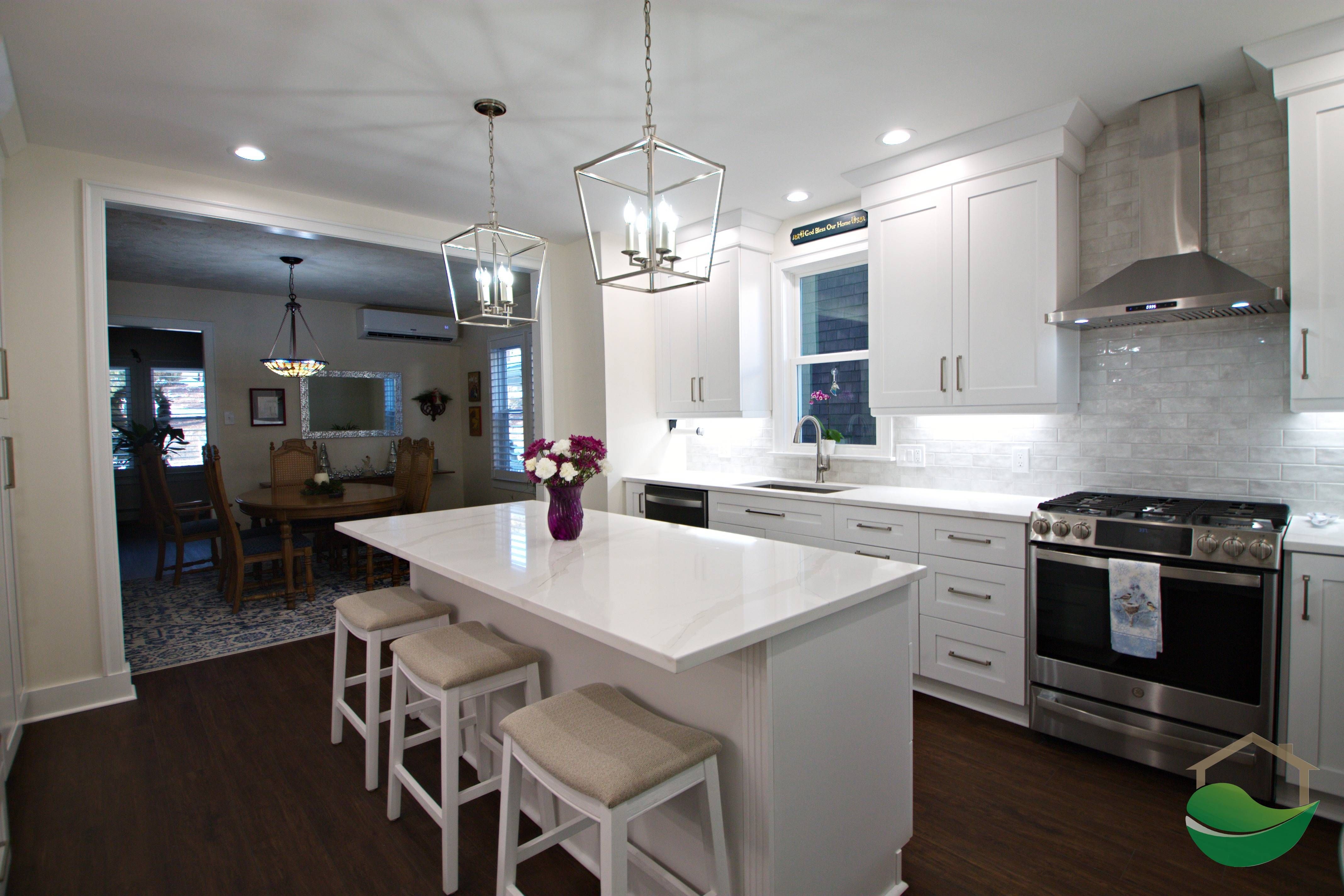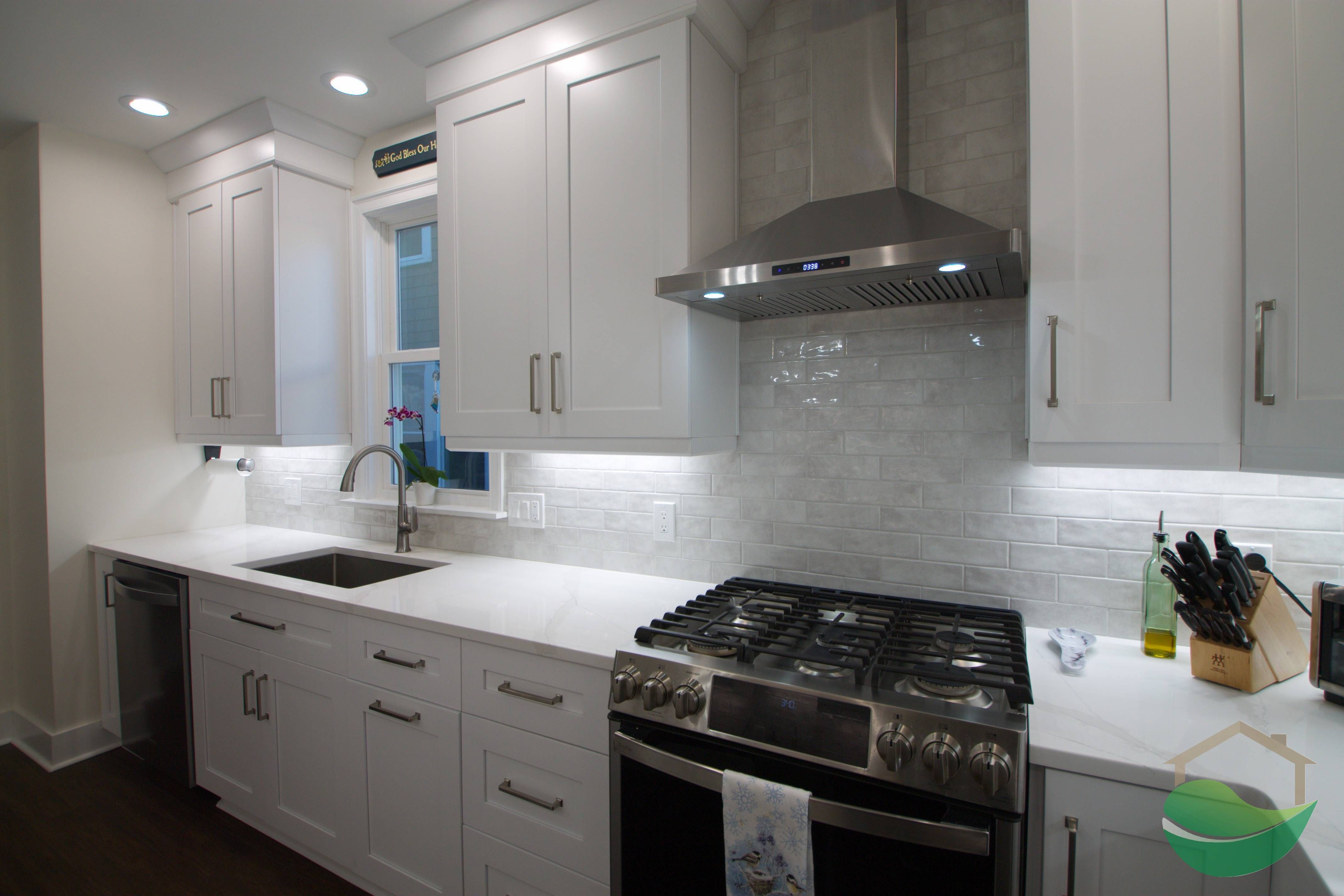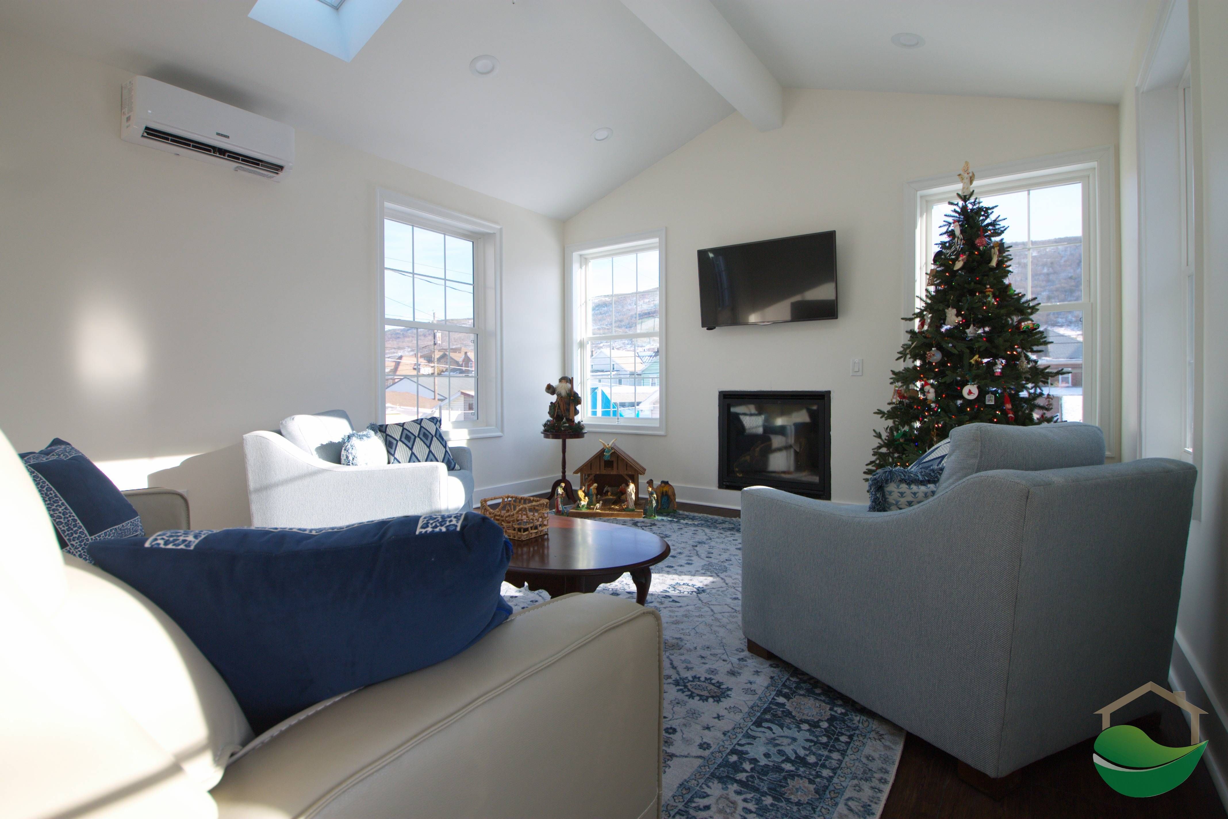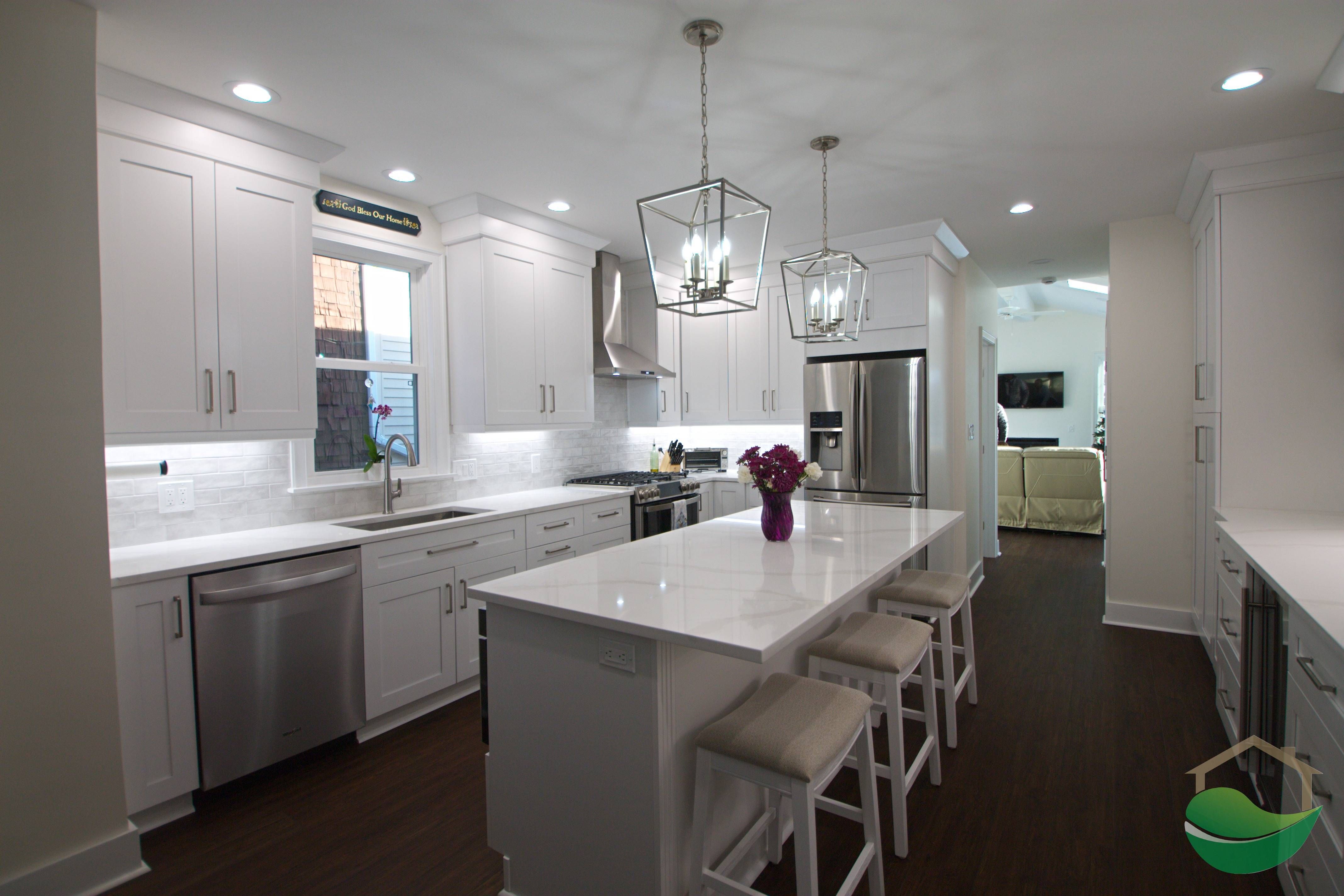 This project was a custom addition built onto a half-double home, a layout that required detailed planning and structural expertise. To create an open-concept kitchen, we installed a hidden steel beam in the ceiling, allowing us to remove load-bearing walls while maintaining full support. The kitchen features white Shaker cabinets with a Carrara quartz countertop for a clean, timeless look. To maximize space, we also removed and relocated the staircase underneath a front-entry closet, creating a larger and more functional kitchen layout. The new great room includes two Velux skylights and a natural gas fireplace with a new gas line installed from the alley. The homeowner is still deciding on a final accent wall design around the fireplace and TV, which will complete the space. What made this project especially challenging was completing all of this within the constraints of a half-double property, where every structural change required careful coordination and craftsmanship. The result is a modern, open, and fully transformed living space.